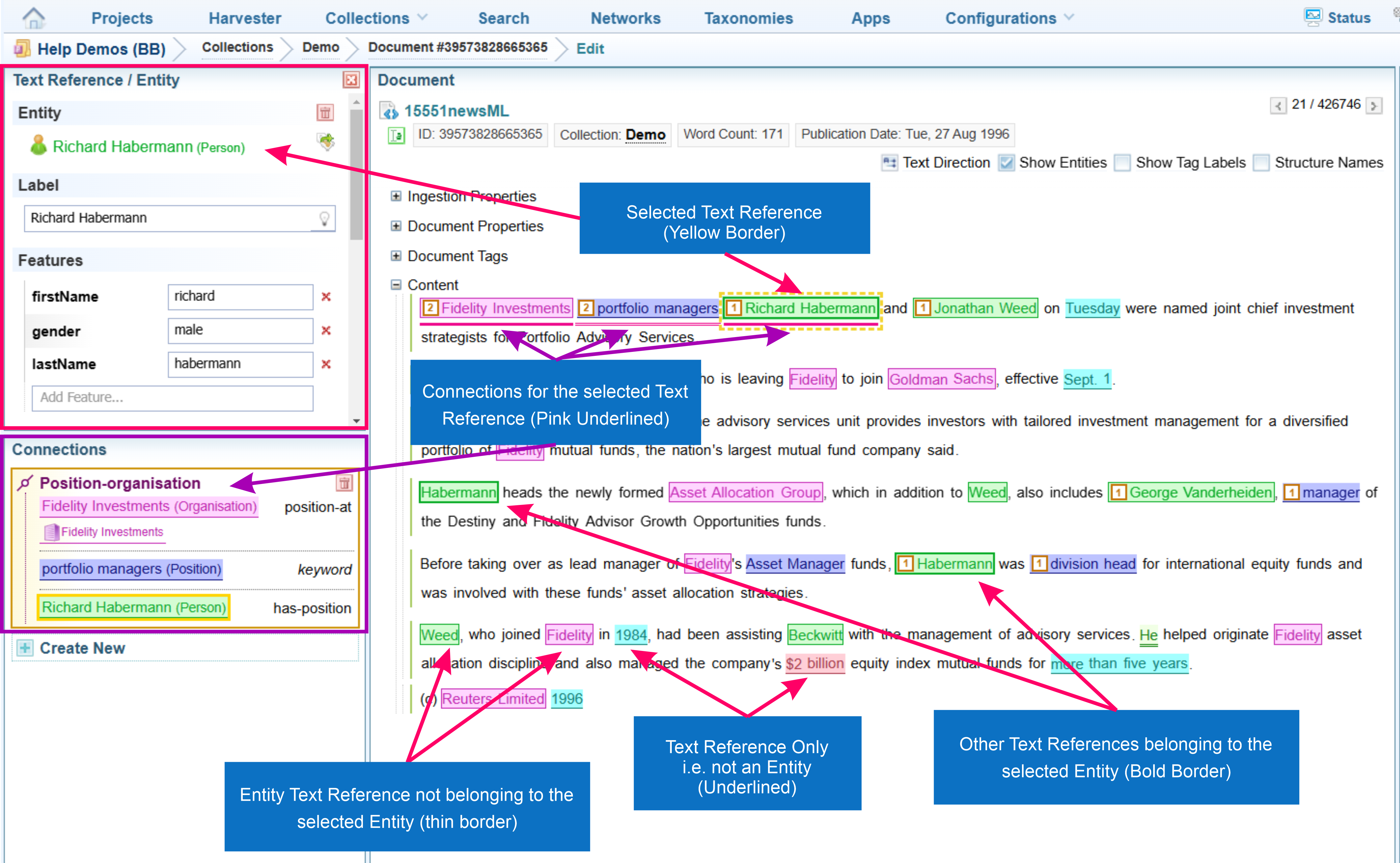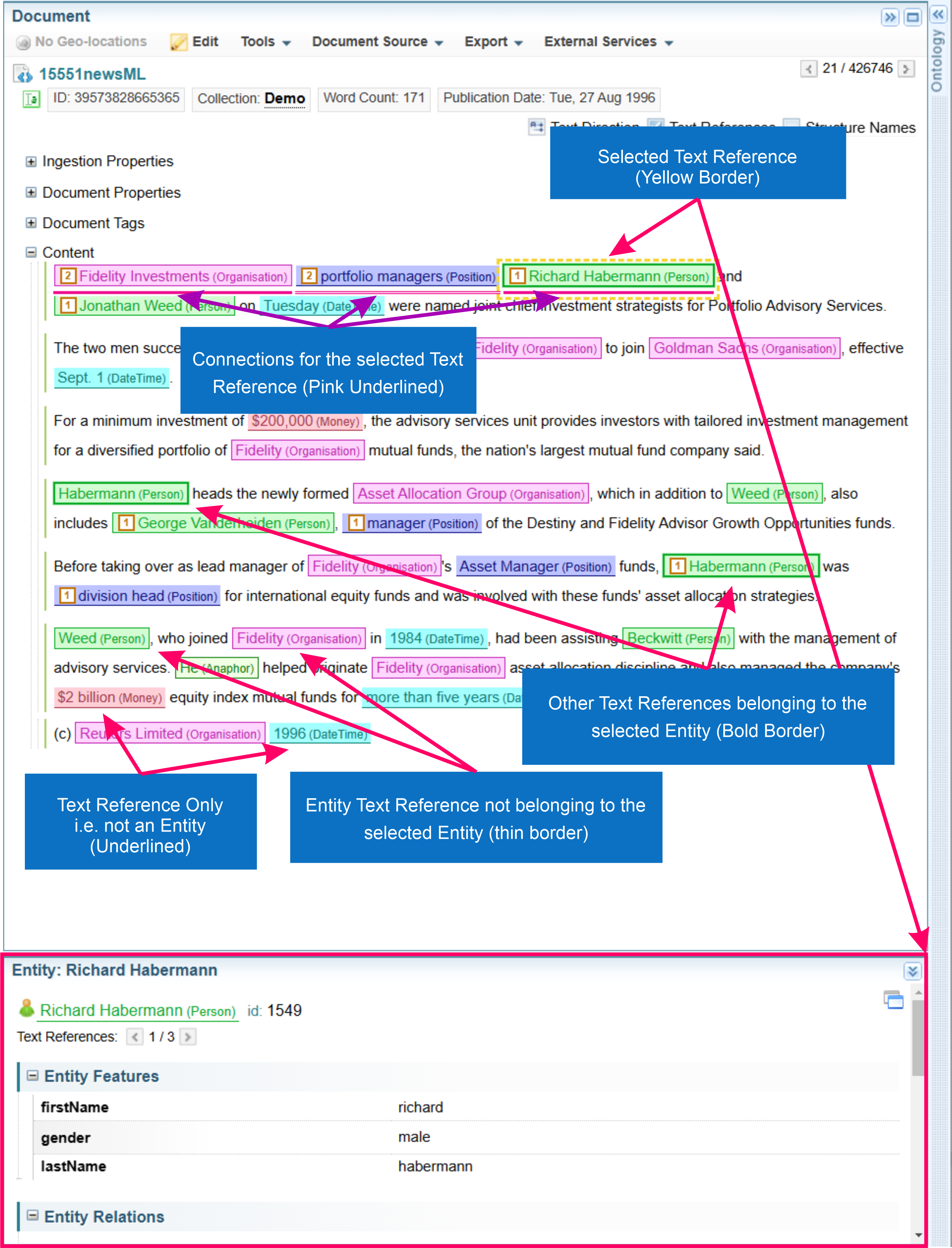 The diagram below describes the ways Entities and Text References are displayed when viewing documents.