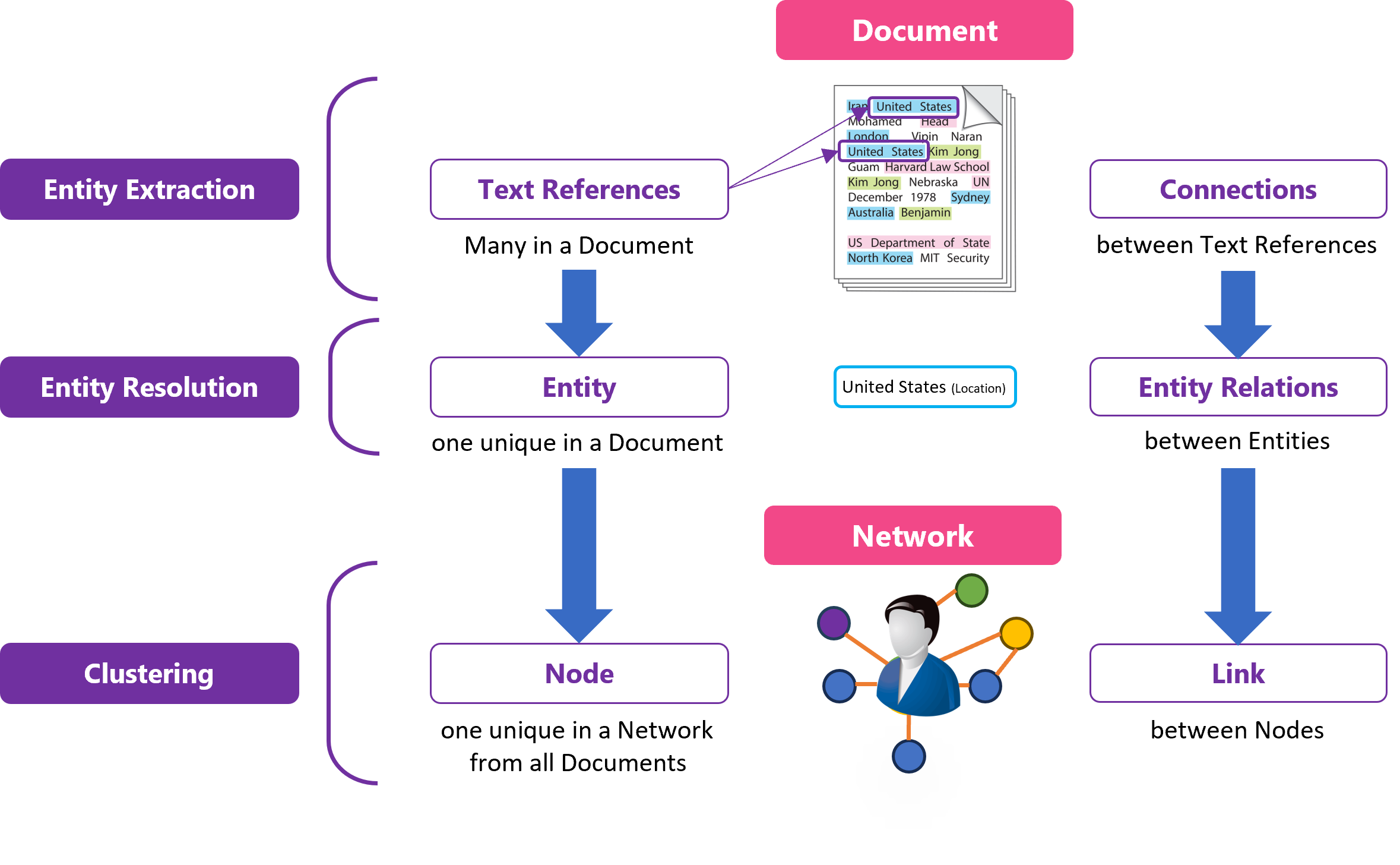 Clustering combines the related Entities across all the Documents in the Collection into a single unique Node in the Network.
