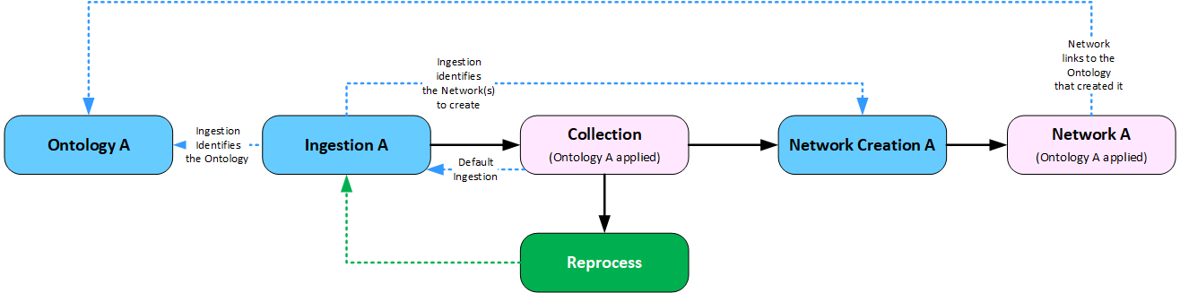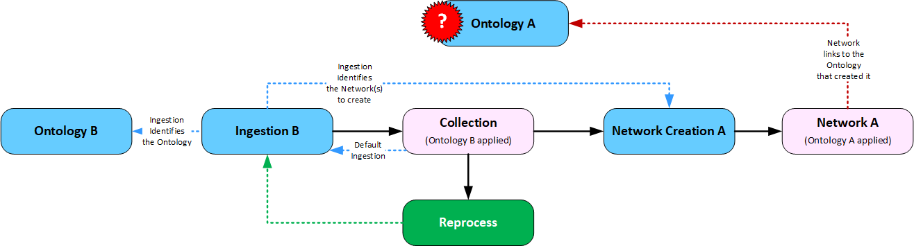 If you change the Collection default Ingestion which is linked to a different Ontology, and then Reprocess the Collection, data populated into the linked Network(s) will still be linked to the Ontology that originally created the Network, as illustrated below.