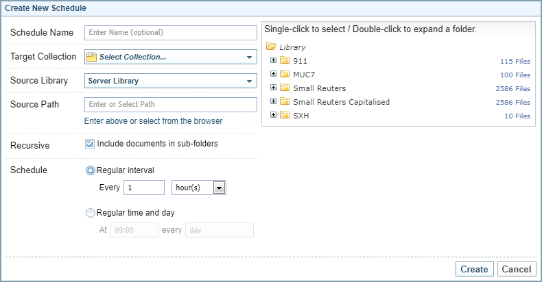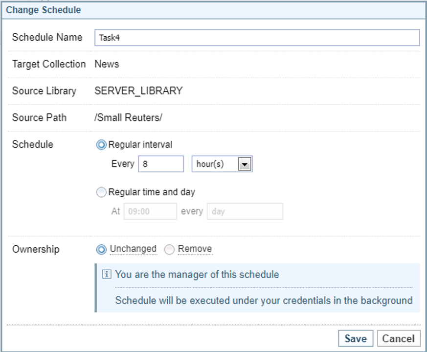 Once an ingestion schedule is created, you cannot change the source (library or mail), or Include documents in sub-folders checkbox. If you need to change these details, you need to delete the schedule and create a new one.