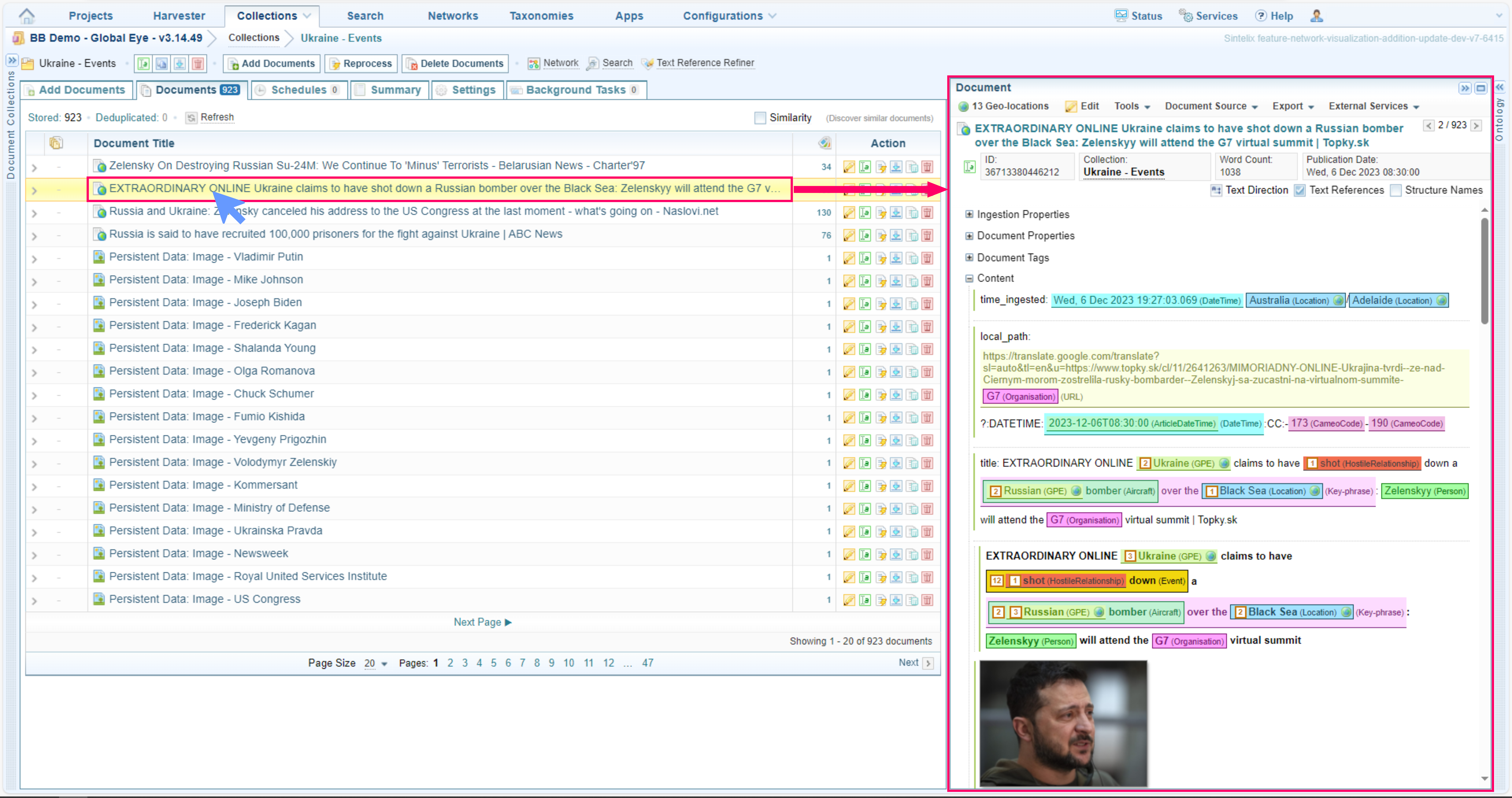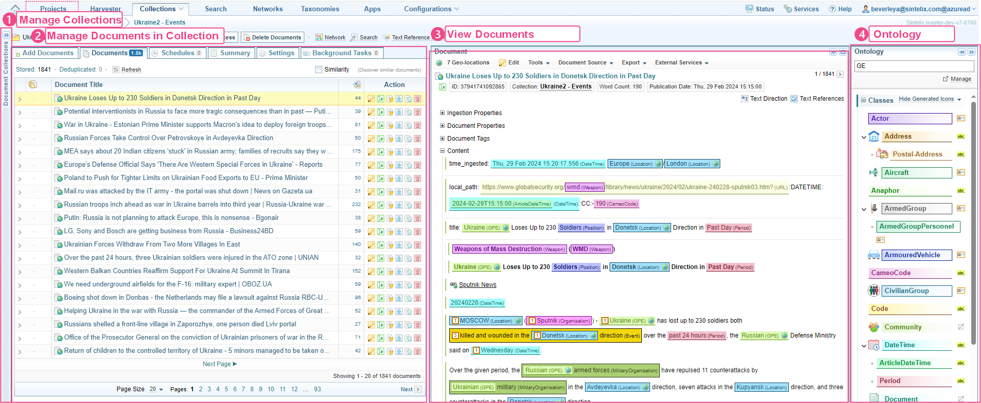The Ontology A Sintelix Configuration that defines the classes that make up the entities, text references and link types in a project. section displays the Ontology used in the active Ingestion Configuration. When the Ingestion Configuration is changed for a collection Once source data has been ingested, the resulting Documents are stored in a Collection. Once Documents are stored in a Collection, you can browse, search and edit Documents. Only text-based Documents is stored in Collections, not the original source files., this panel will update accordingly.