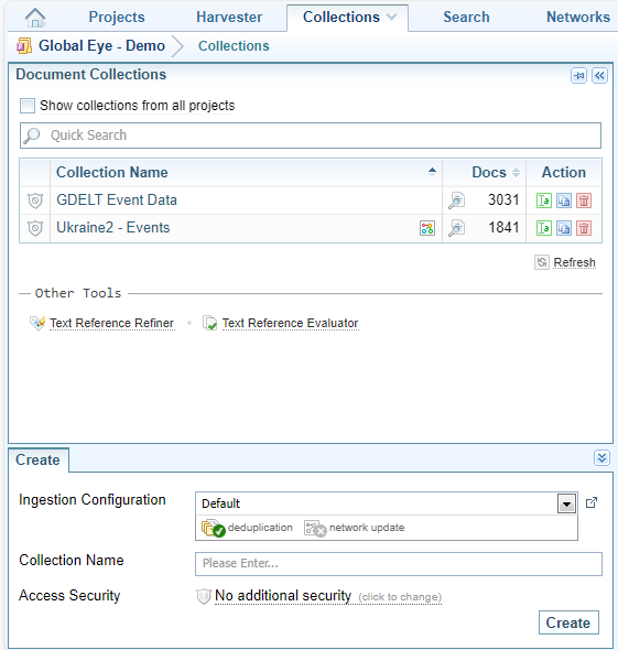The Collections Toolbar enables you to modify settings that affect an entire collection Once source data has been ingested, the resulting Documents are stored in a Collection. Once Documents are stored in a Collection, you can browse, search and edit Documents. Only text-based Documents is stored in Collections, not the original source files..