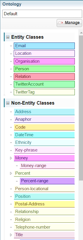 The Ontology section provides you with an overview of the entity classes and non-entity classes used to label Text References Text that has been marked up (that is, highlighted with a coloured label) in a document. in your documents. The Ontology panel also displays connection types for creating links between entities.