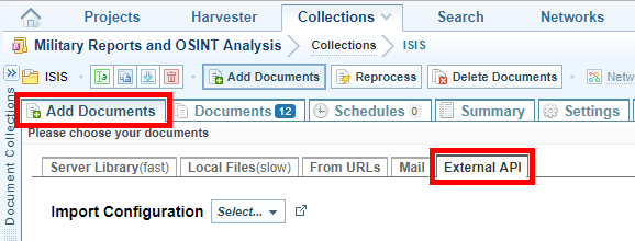 - Select the Add Documents tab, or button, then select the External API tab.