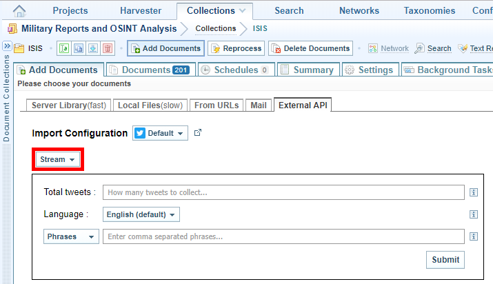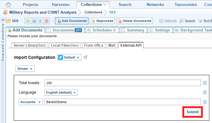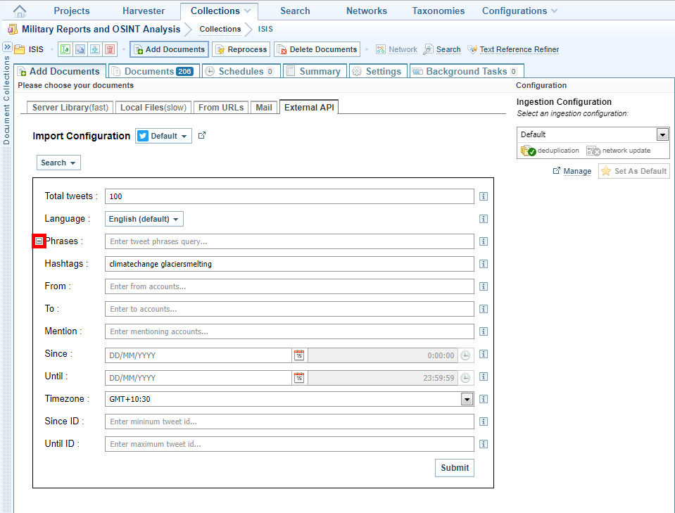 - Select Submit. A background task begins to ingest the tweets into the collection. Ingestion The process of converting added files into Sintelix documents in Sintelix will stop when the total number of tweets you specified have been ingested.