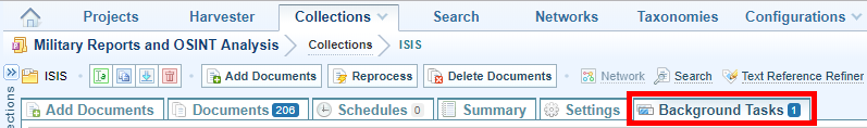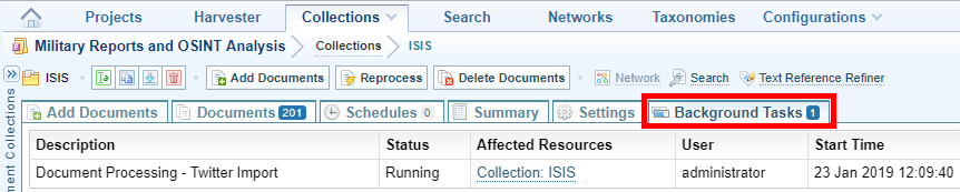 A background task begins to ingest tweets into the collection. Ingestion The process of converting added files into Sintelix documents in Sintelix will stop when the total number of tweets specified has been ingested.