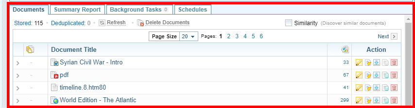 You can now explore and analyse the information in the collection Once source data has been ingested, the resulting Documents are stored in a Collection. Once Documents are stored in a Collection, you can browse, search and edit Documents. Only text-based Documents is stored in Collections, not the original source files. (see ).