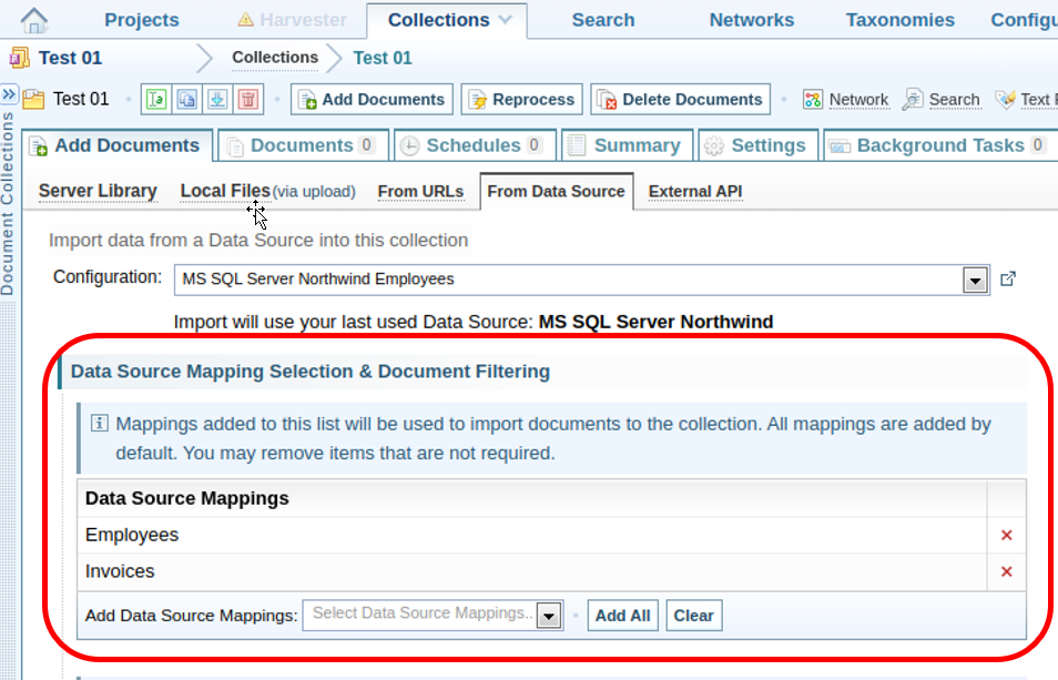 Select or deselect Data Source Mappings from the list one by one, or Add All or Clear the list.