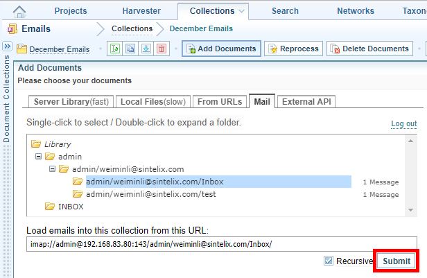 By default, emails in the subfolders will be also ingested. Deselect the Recursive check box if you do not want the subfolders to be ingested.