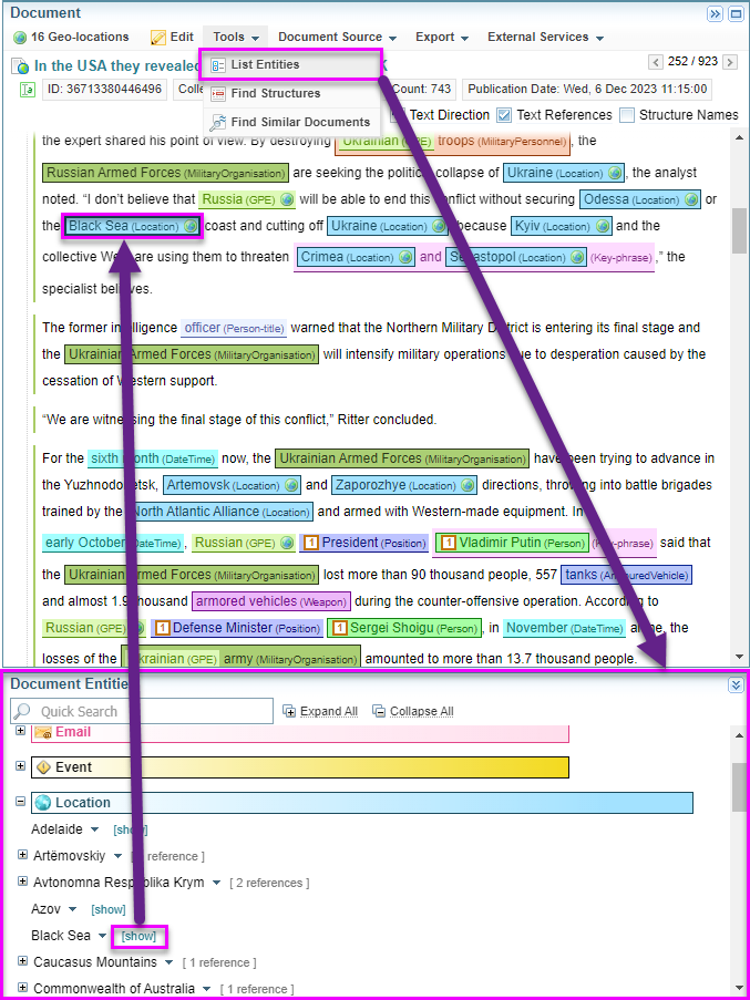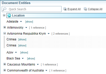 When a class of entity is expanded (for example, Location), you can see the entities of that class that occur in the document. You can also see how many times that entity is referenced in that document, and easily jump to each occurrence by selecting [show].