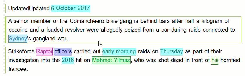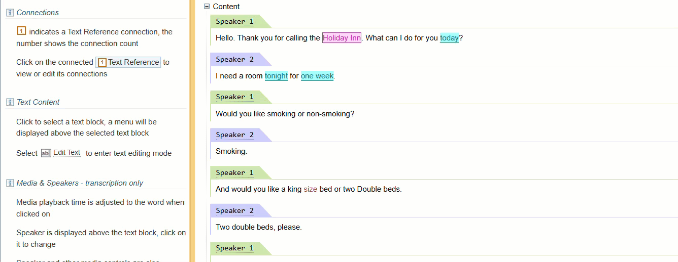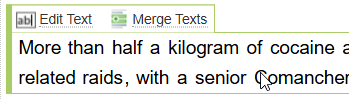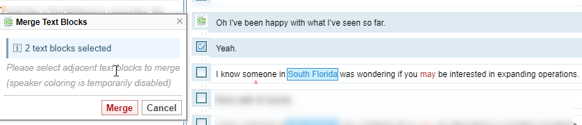 In some cases you may want to split or merge text blocks. For example, when editing an audio transcript you may want to assign parts of a transcript to specific speakers, you would need to merge or split the text.