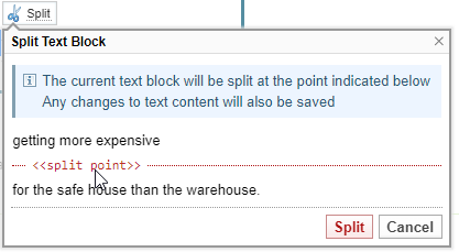 - When the Split Text Block appears, to show the split point, click Split to confirm your selection point, or Cancel to redo.