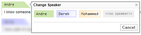 To change a speaker for a portion of the text box, first split the text, then apply the new speakers name.