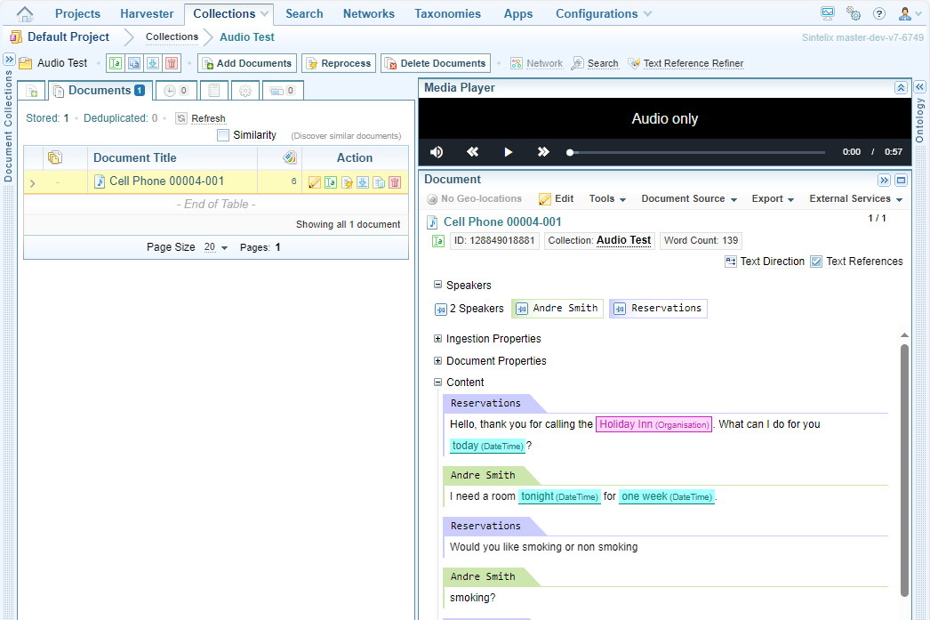 When viewing a transcribed document, a media player is shown at the top of the document pane and the speakers are identified in the document.