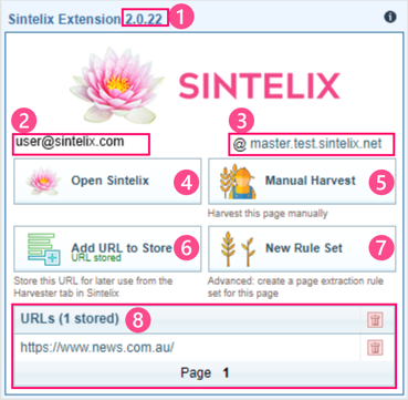 Select this option to copy the current web page URL to a URL list (displayed at the bottom of the extension). See Add URL to Store. This is used in Sintelix to Harvest using a list of URLs. See URL List. |