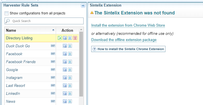 - Go to Configurations > Harvester Rule Sets and click on one of the Rulesets to download the extension zip package from Sintelix, as shown in the following screenshot: