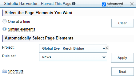 (Advanced Option) Select the Advanced checkbox to choose a Rule set to automatically select page elements to harvest.