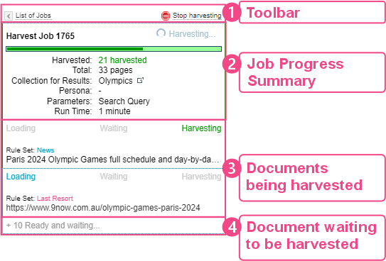 Summarises the status of the harvest job. Text in green indicates the job is in progress. |