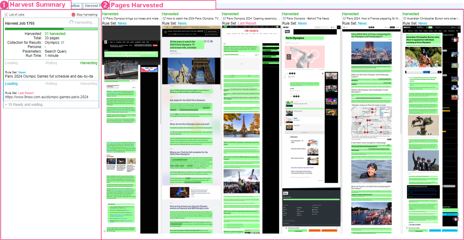 Pages Harvested: displays each page harvested, with the page title, the Rule Set applied to the harvest and the green highlights showing the elements included in the harvest. Each new page being harvested is added to the left, with each page moving to the right.