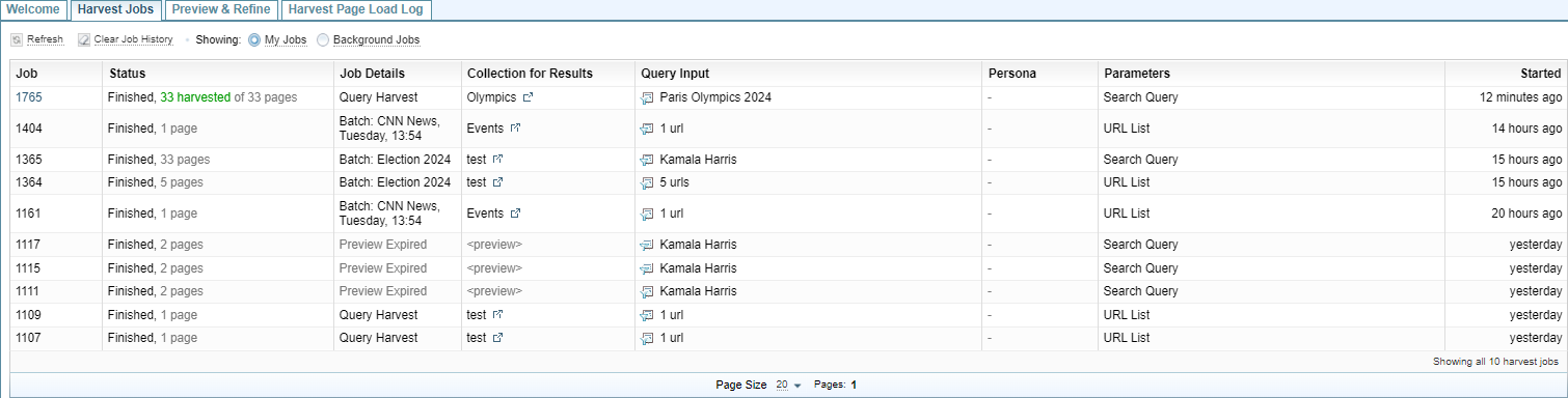 Select Harvester > Harvest Jobs to display: