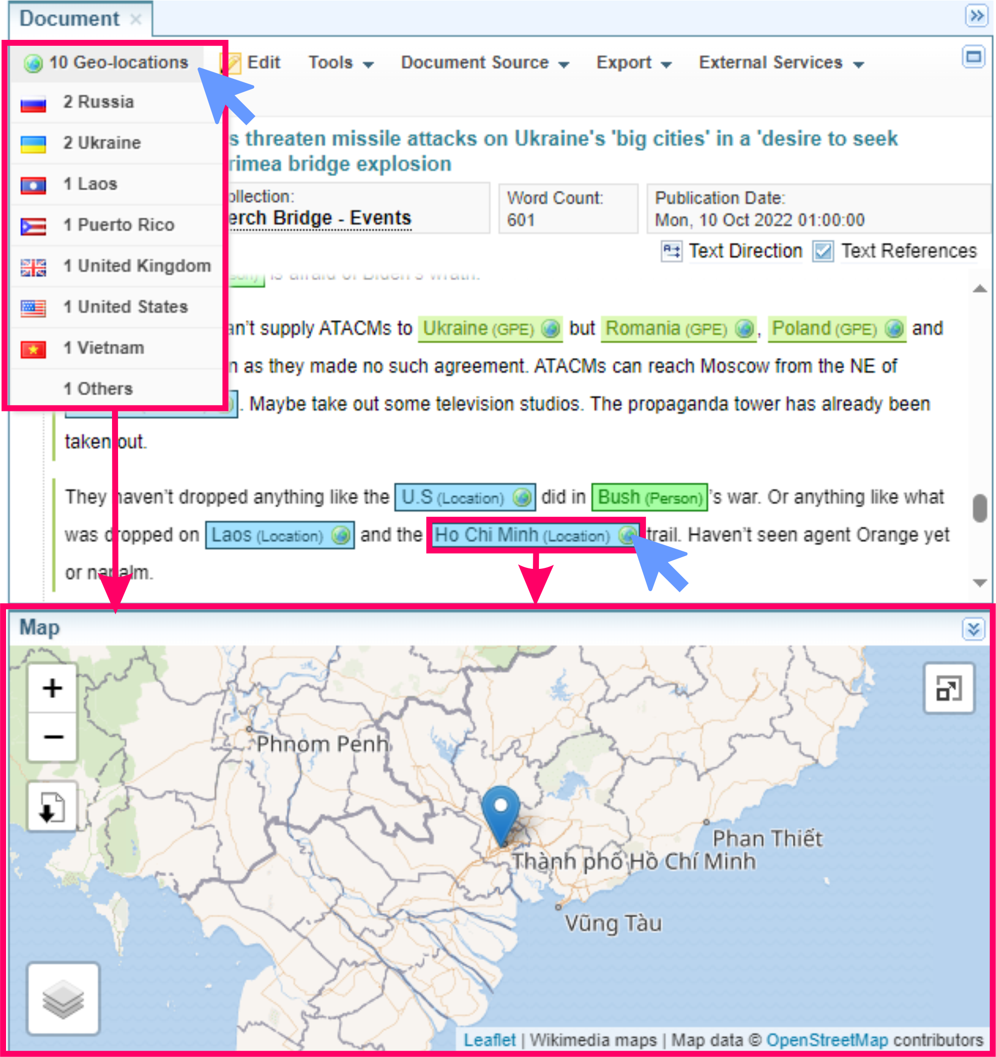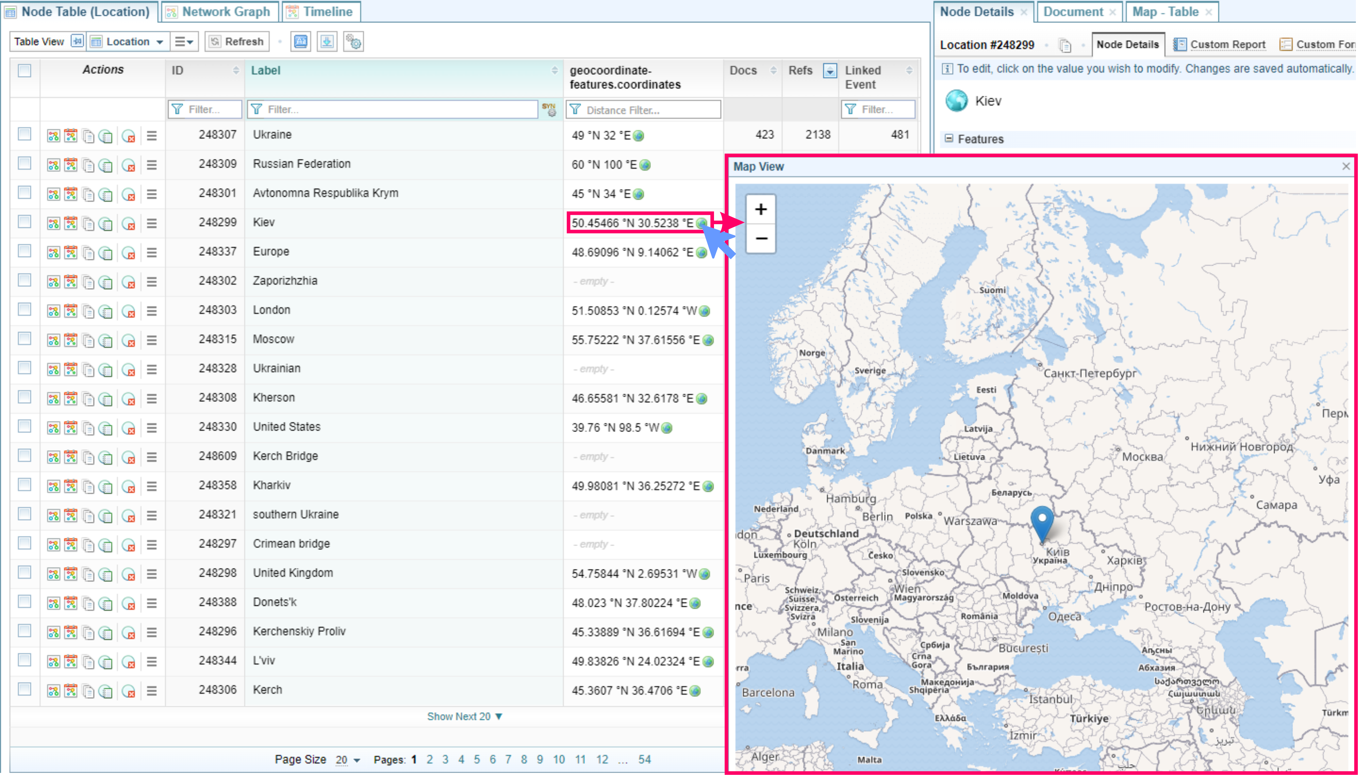 As documents are ingested into Sintelix, the geographic locations in the documents are identified. Sintelix cross-references location names with an internal database, then assigns geocoordinates (latitude and longitude) to each location.