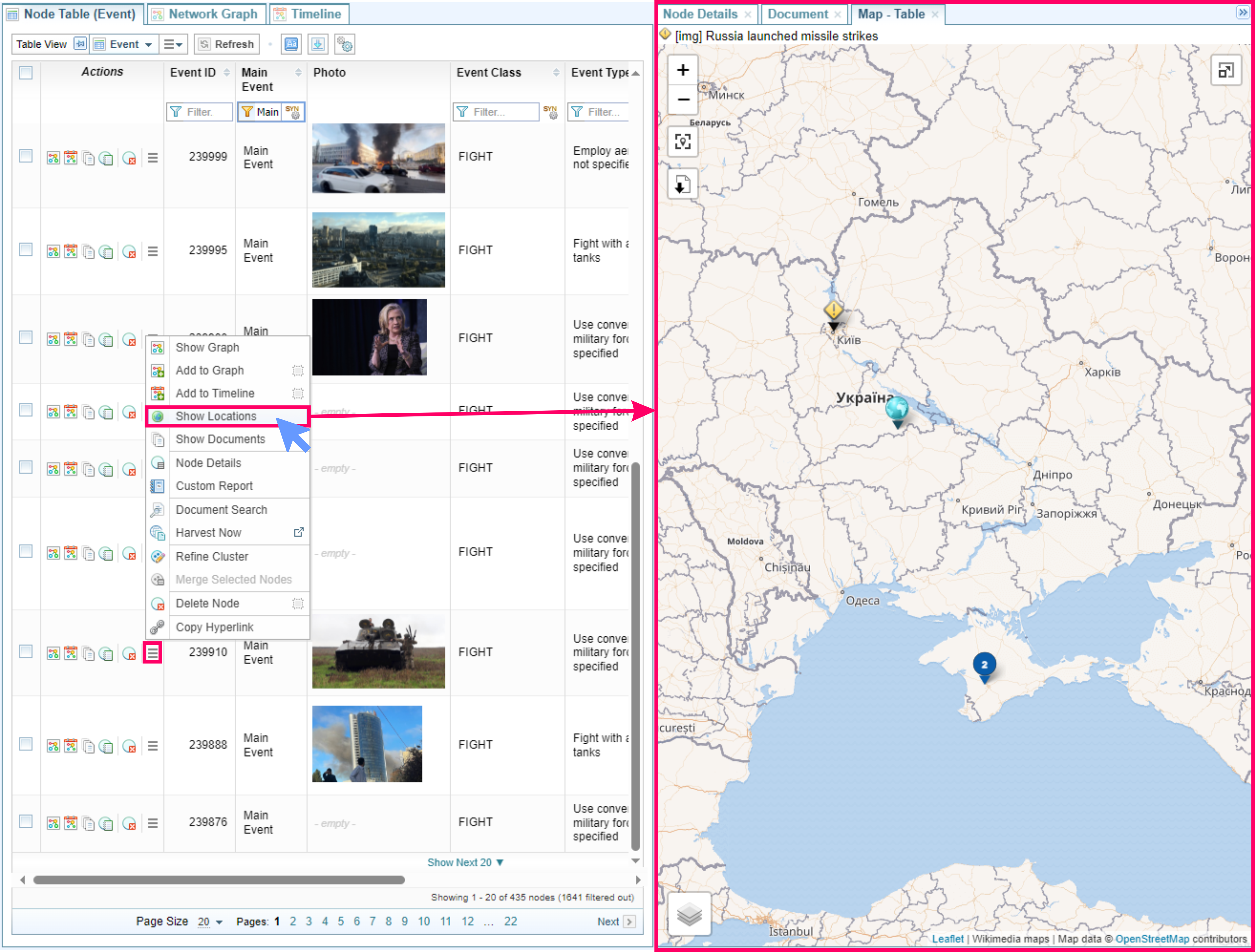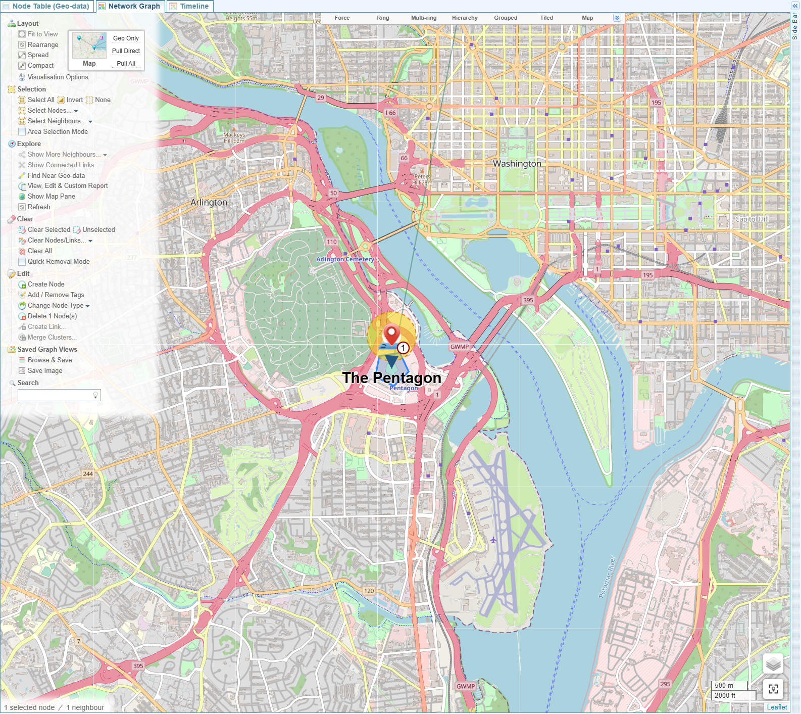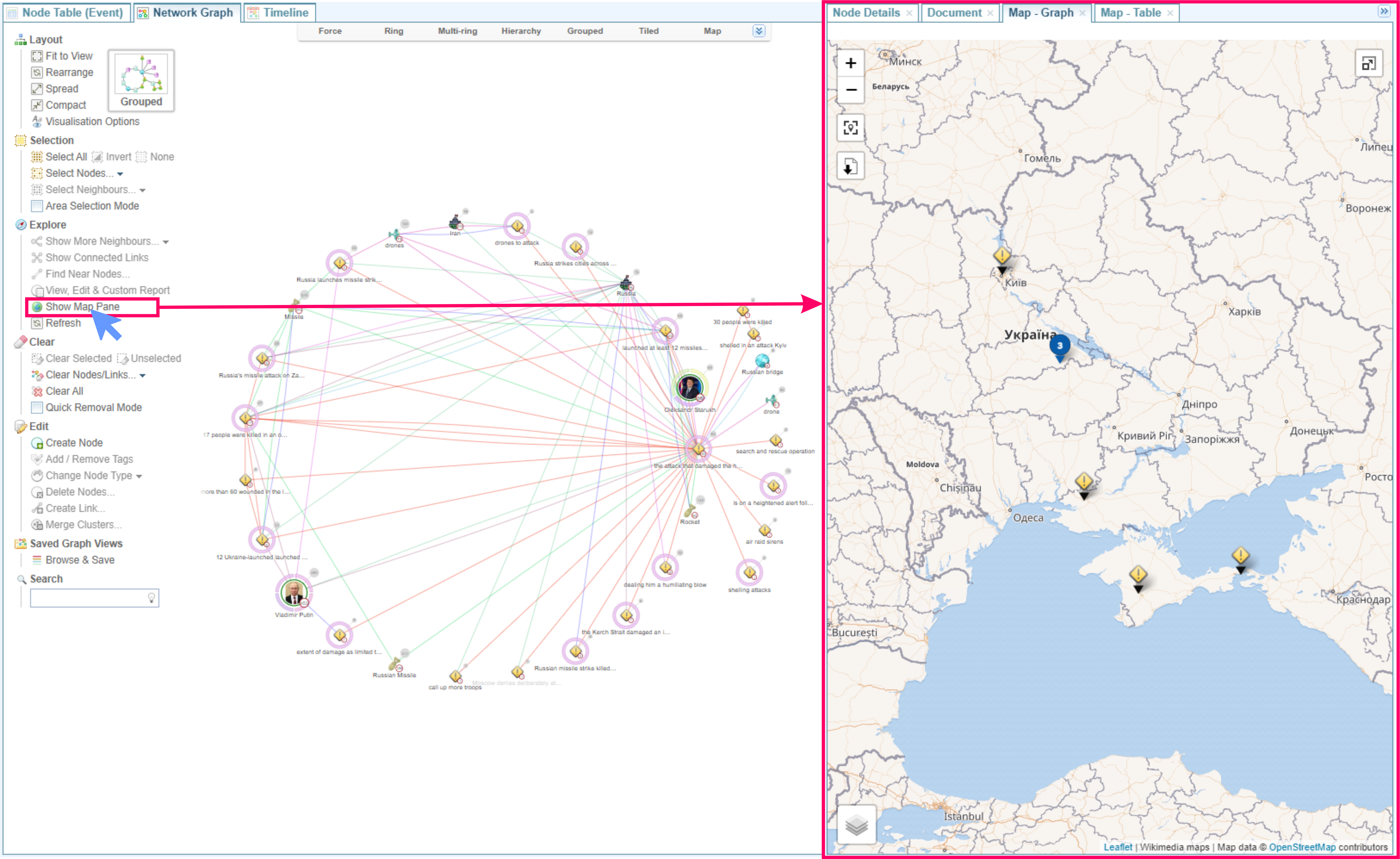 Selecting a location on the map will select the related nodes in the Network Graph.