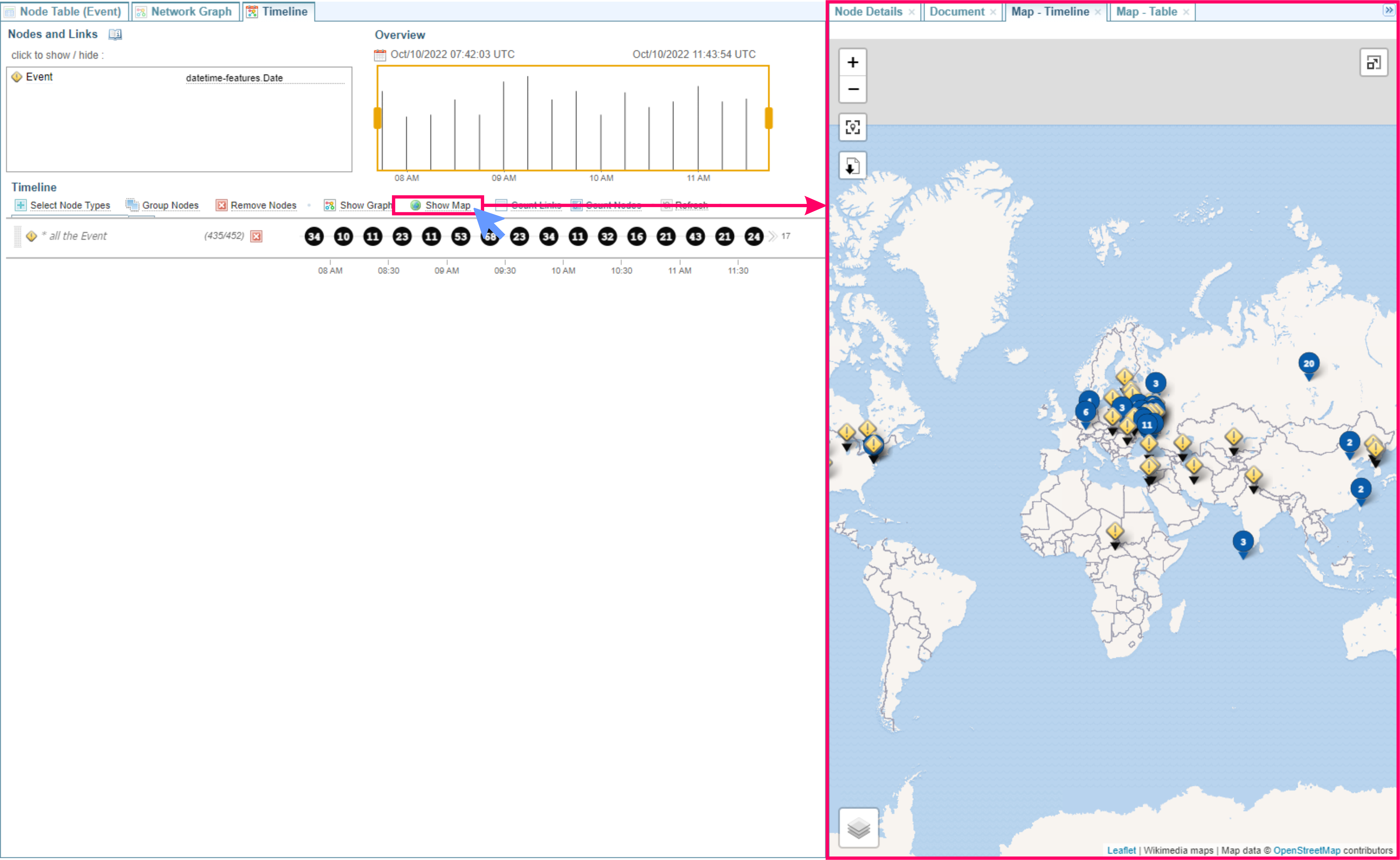 Show Map option to open the Map - Timeline pane showing locations included in the current timeline.
