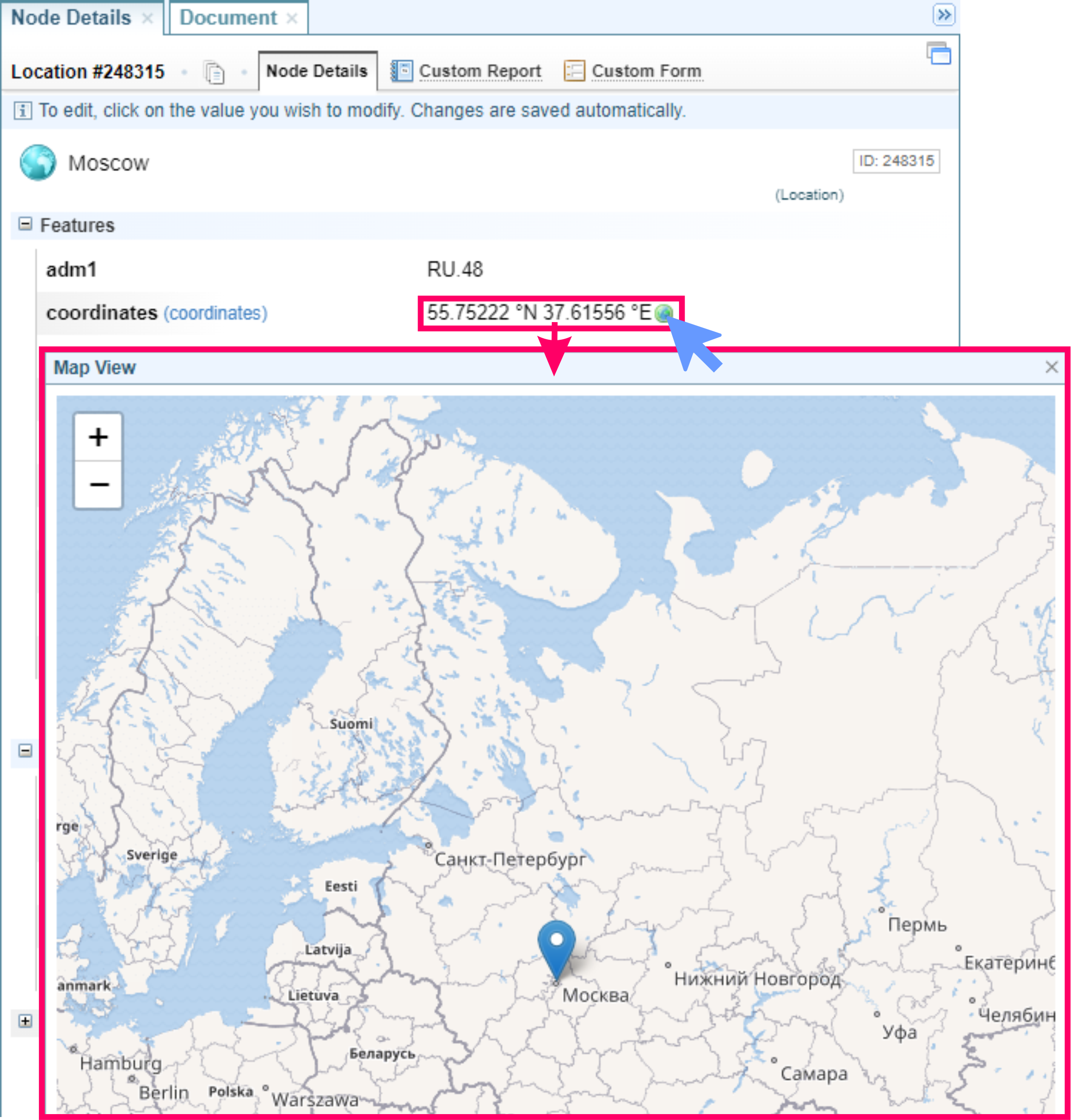 location entity in the document to open a Map View showing the selected location.