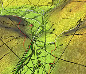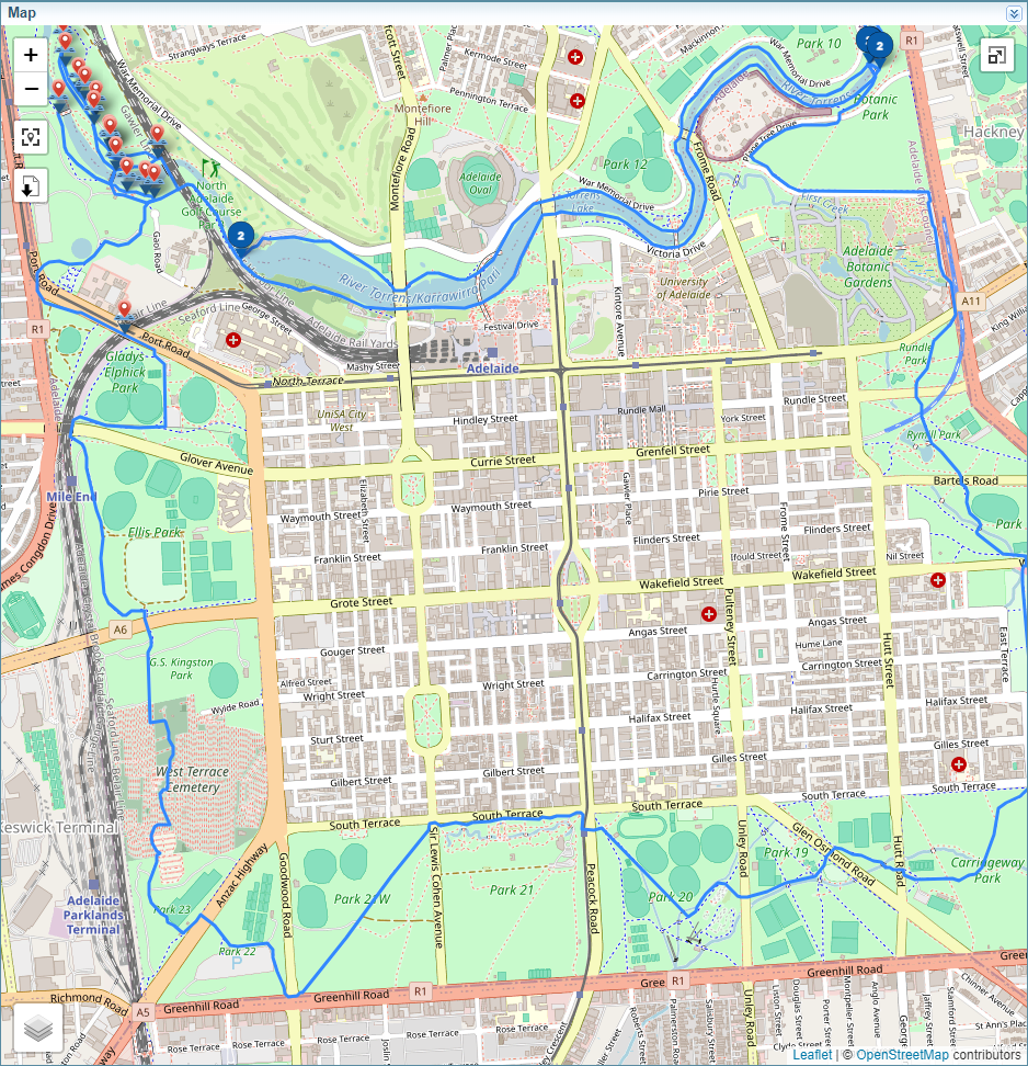 The map below shows routes and locations stored in a kmz file.
