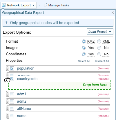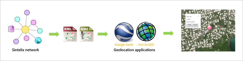 The Network nodes that contain geographical coordinates (latitude and longitude) can be exported as KML Keyhole markup Language, an XML notation for expressing geographic annotation and visualization within two-dimensional maps and three-dimensional Earth browsers such as Google Earth. and KMZ Keyhole markup Zip, a file format used to compress and distribute kml files. files which can then be uploaded to the geolocation applications such as Google Earth An application that renders a 3D representation of Earth based on satellite imagery. Sintelix can export geographical data from networks, which can then be uploaded to Google Earth. and Esri ArcGIS.