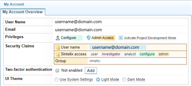 your privileges, indicating your assigned role (Investigator, Analyst or Configurer) and if you have Admin Access (see Roles and Access Levels).