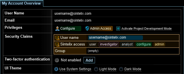 The Sintelix Login page will default to the system default theme. Once you have logged in, your personal theme settings will apply.