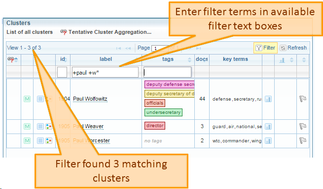 Filters are available for ID (Node ID), label and tags. The filters on label and tags are applied according to the Search rules for Key Word search. The result list is updated as you type (after a short delay).
