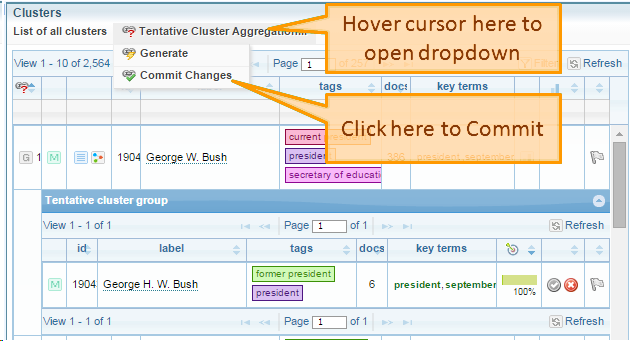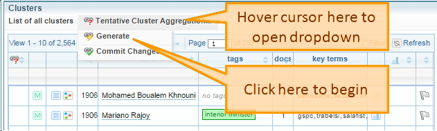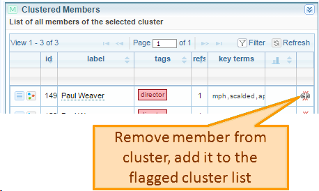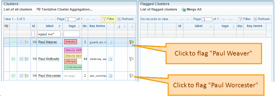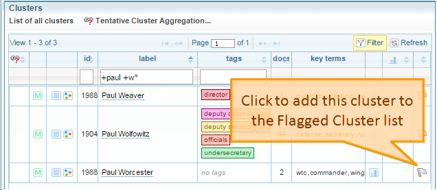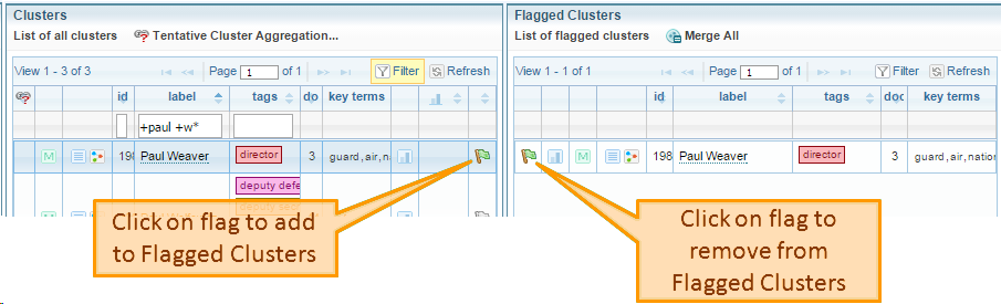 Flagging a cluster adds it to the Flagged Clusters list. The Flagged Clusters list is where clusters can be merged.