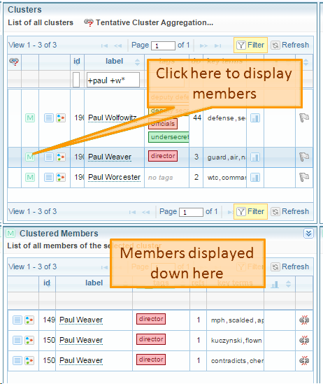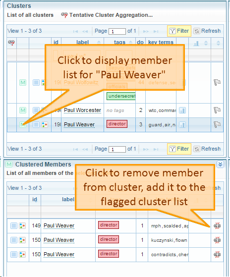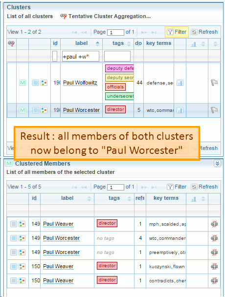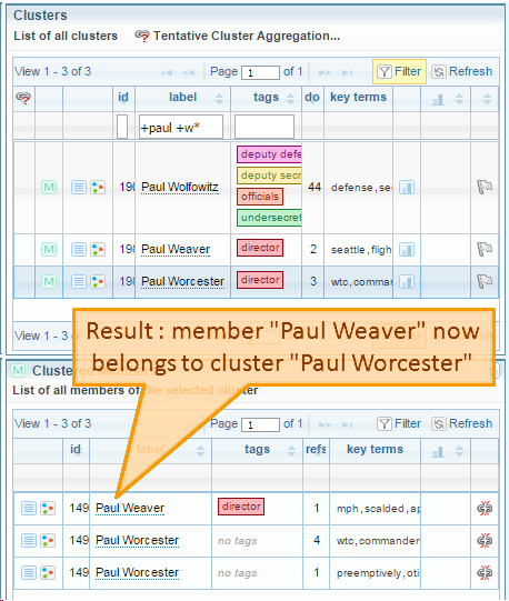 In this example one member of the "Paul Weaver" cluster will be moved to the "Paul Worcester" cluster.