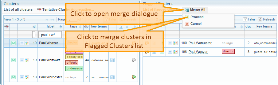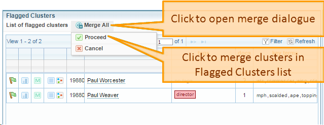 All clusters in the Flagged Clusters list can be merged with the Merge All button. In this example the Clusters labelled "Paul Worcester" and "Paul Weaver" will be merged. The example is presented to demonstration the mechanics of merging clusters, the clusters were chosen arbitrarily (and will be easy to separate again !).