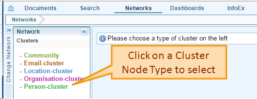 For this example, Person-Cluster was selected. The image below shows the default display once a Cluster Node type has been selected. The page looks a little crowded because the browser size was reduced to display the entire page here without losing text readability.