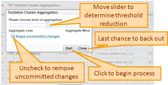 When the clustering process runs (at Network creation, or from the Network view), it creates clusters from simple nodes based on proximity exceeding a threshold value. The Tentative Cluster Aggregation tool proposes aggregation based on lowering the cluster threshold. The tool uses a slider which allows the user to select one of nine threshold reduction levels.