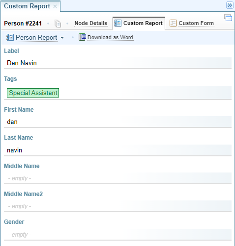 à Custom Report displays a Report customised for that node type which can be downloaded into Word.