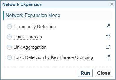 The Network Expansions will only show if there are the required nodes or links within the Network. For example, if there are no Person entities, the Community Detection option will not be shown.