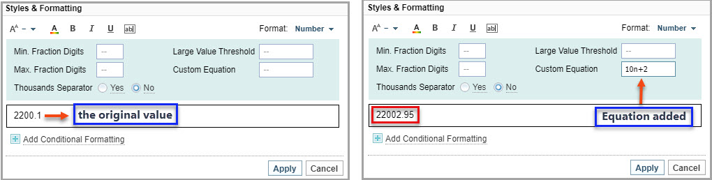 Custom Equation - Display the value using a common math expression such as 2n, n/10. The n in this case refers to the original value displayed in the field, and the equation is applied onto the original value, as shown in the following example: