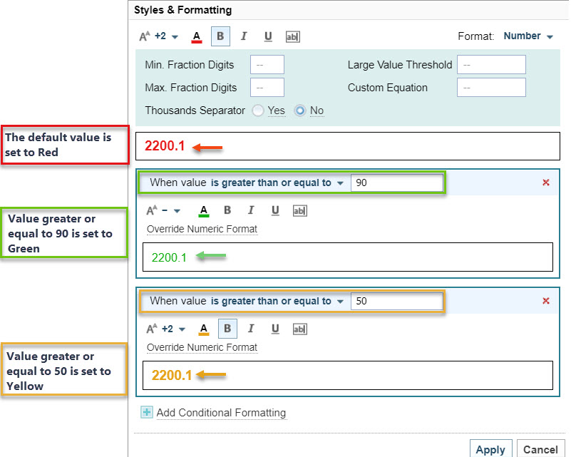 The following example screenshots illustrate the styles applied as per the set conditions: