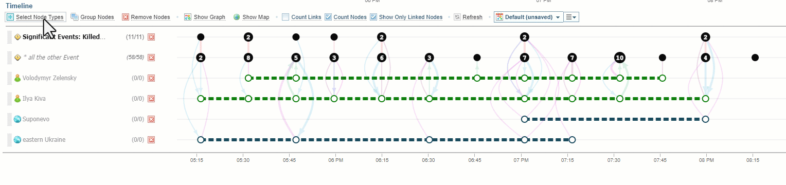 The Timeline Node Selection allows you to select, sort, group and remove entity nodes from the Timeline Graph.