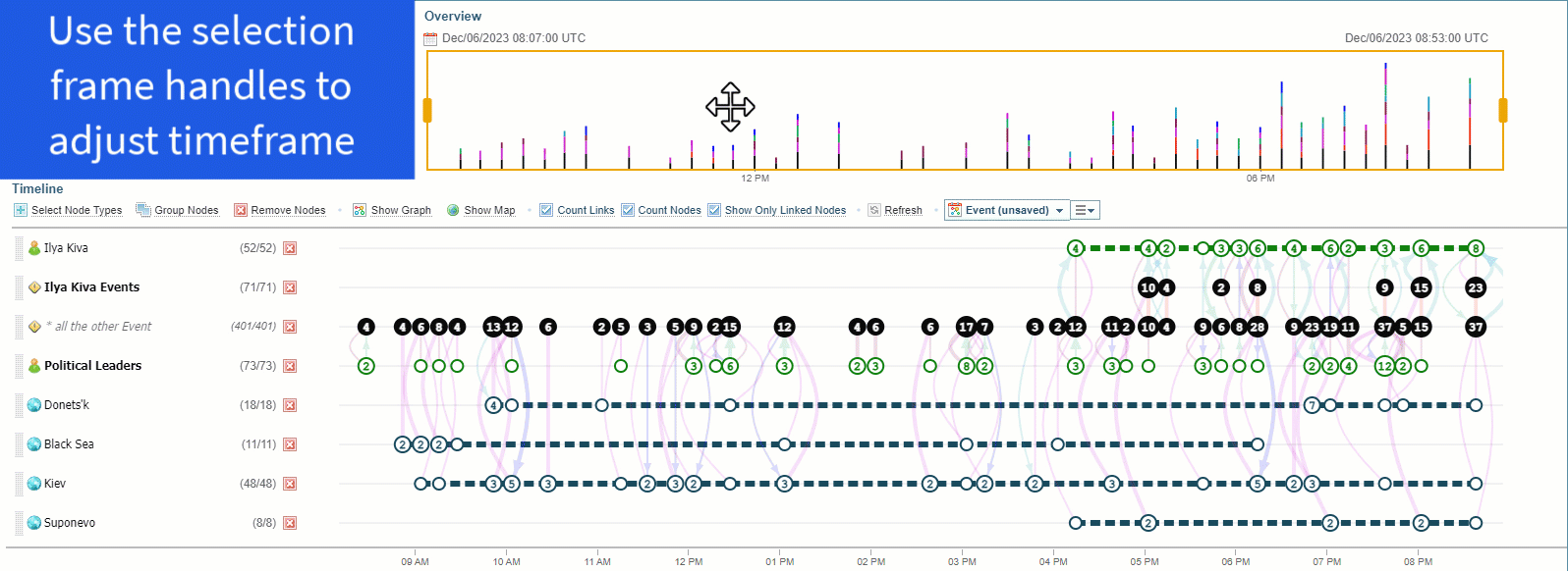 Timeline Graph - displays a visual representation of nodes and links against the selected nodes within the selected timeframe and provides options for controlling the display.
