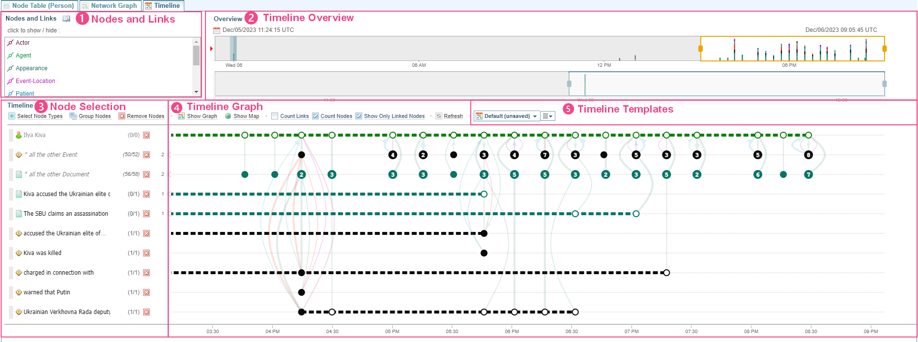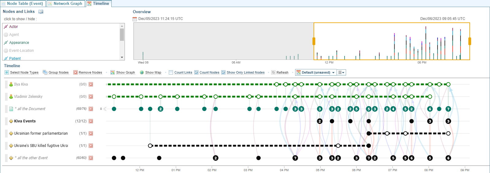 The types of links and temporal nodes shown in the timeline are shown in the Nodes and Links area at the top left of the pane.