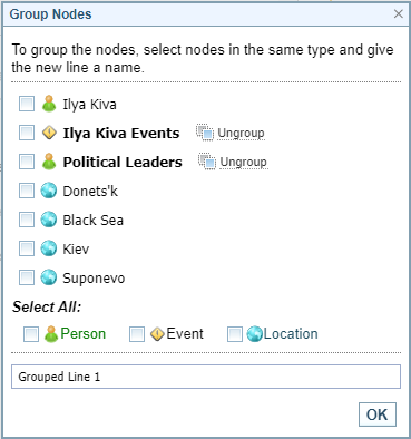 You can group individual nodes into one line on the timeline, and give it a label. This can be useful, for example, when analysing a related group of events or persons.