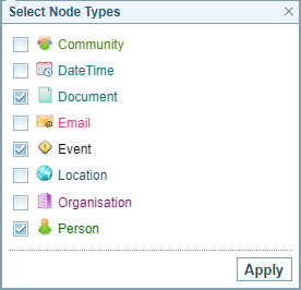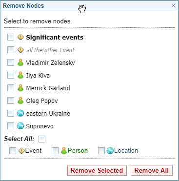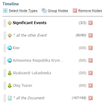 The Timeline Node Selection allows you to select, sort, group and remove entity nodes from the Timeline Graph.