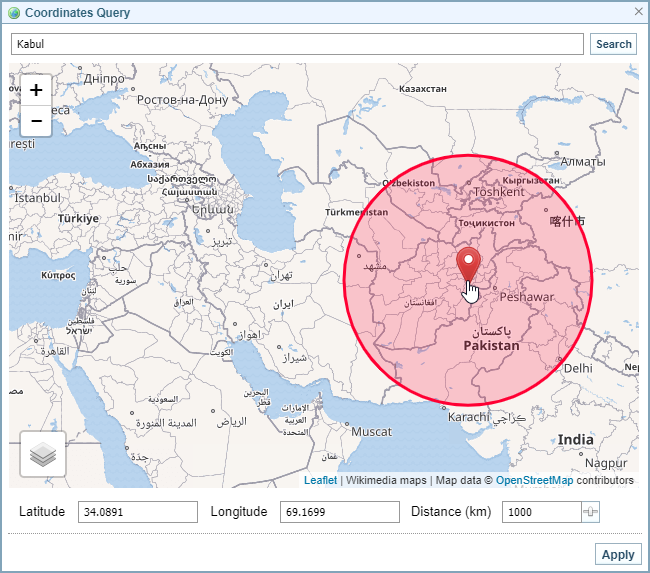 - To change the radius, enter the range (in kilometers) in the Distance field below the map, or click the icon beside the field, then use the slider to zoom in or out.