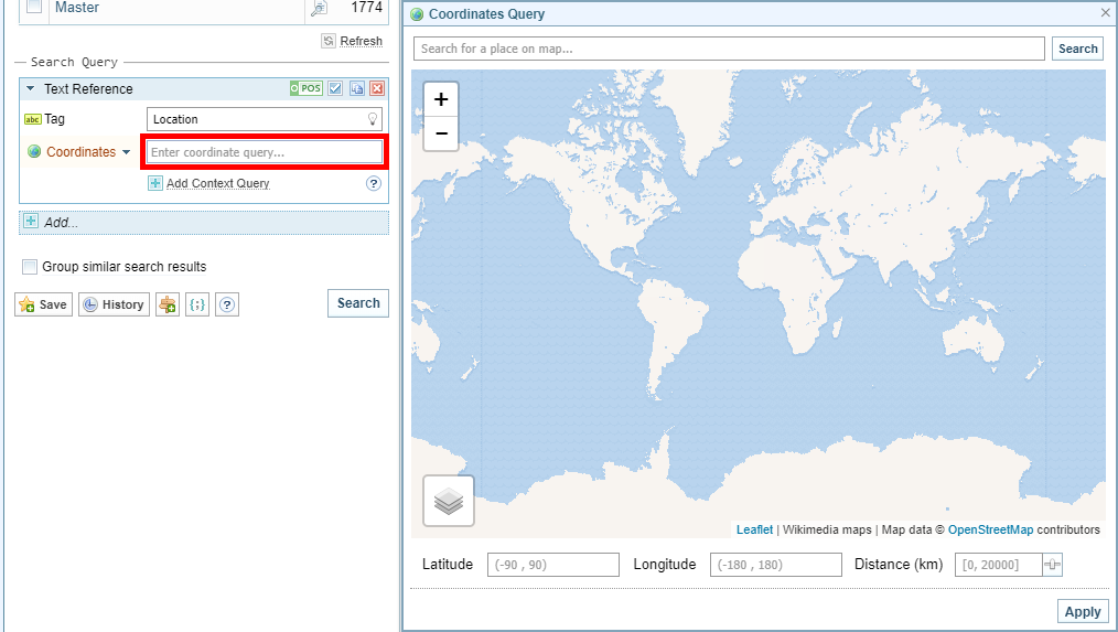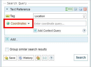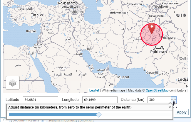 You can search for documents that contain references to locations that fall within a specific geographic area. For example, you may want to find documents that reference locations within a 500 km radius of a particular capital city, or a disease outbreak or a war zone. A geocoordinates search uses the Text Reference search facet.