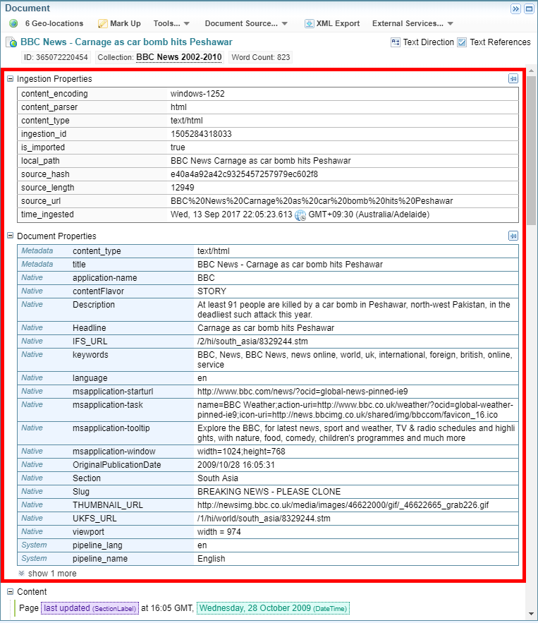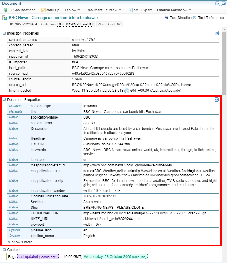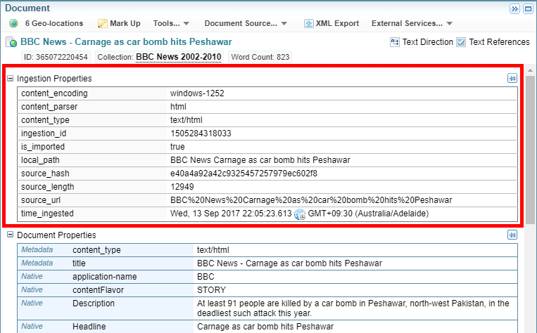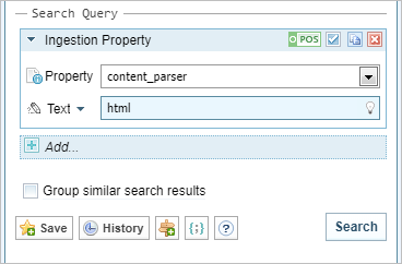 Use this search facet to search for information in the ingestion properties of documents, for example, the language settings and the parser that was used.